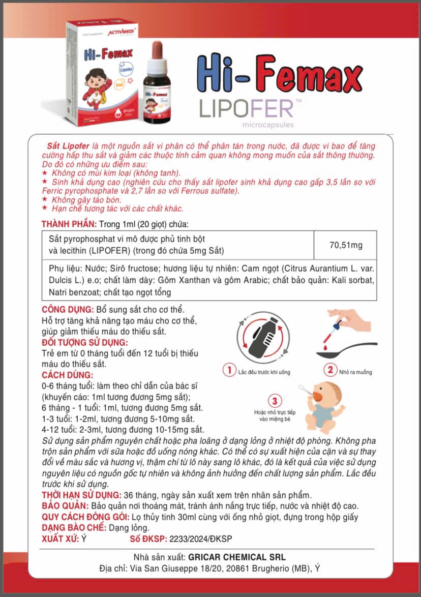 Thành phần hàm lượng trong 1ml (xấp xỉ 20 giọt): Sắt pyrophosphate micronized (Lipofer) tương ứng7mg sắt.Phụ liệu: Si rô Fructose, chất làm đặc: xanthan gum, hương tổng hợp (hương anh đào và hương dâu tây),chất bảo quản: kali sorbate, natri benzoate